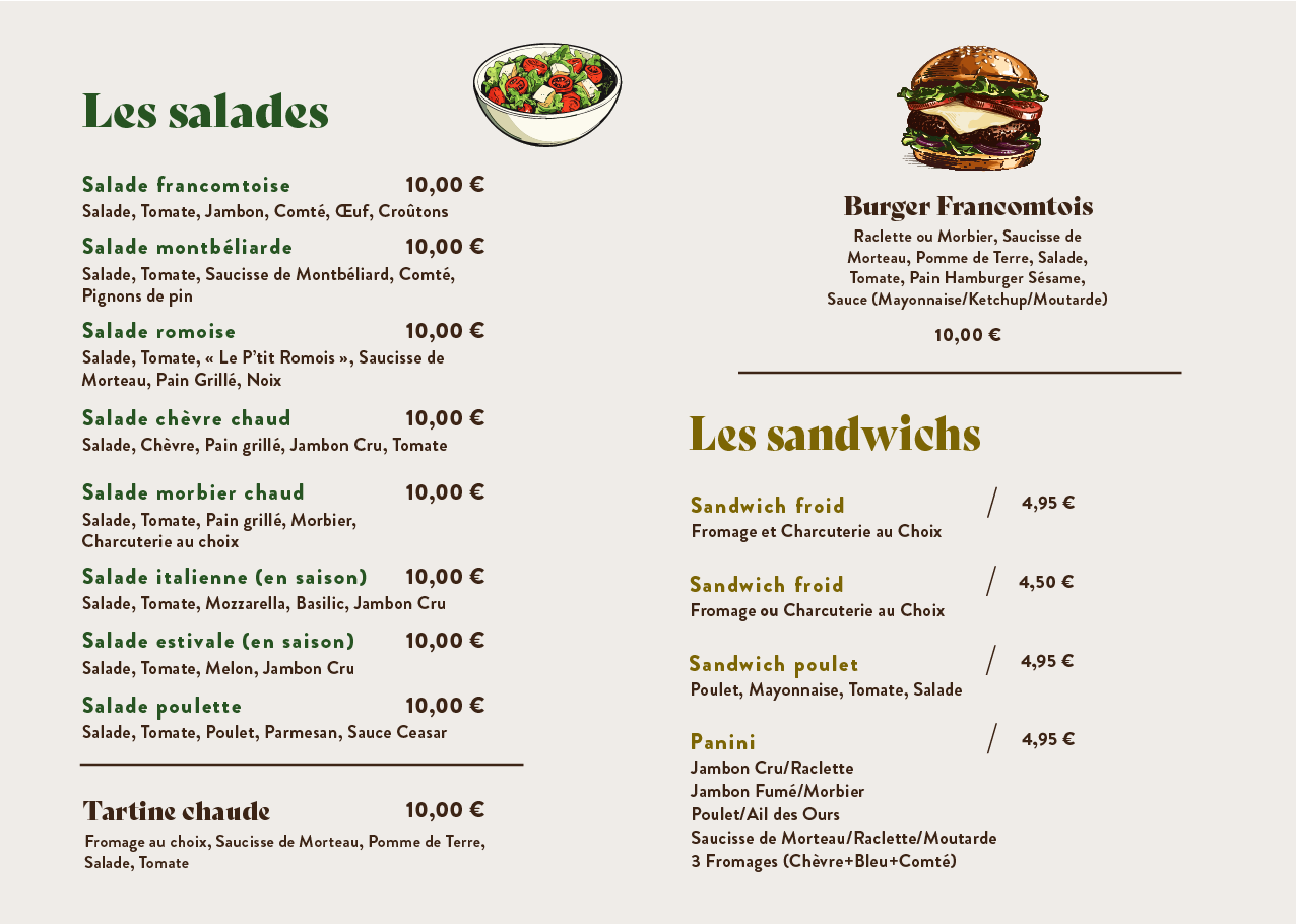 Découvrez nos fromages et charcuteries sous forme de planches à déguster, mais aussi dans des salades, des sandwiches chauds et froids sans oublier nos authentiques assiettes franc comtoises et raclettes !